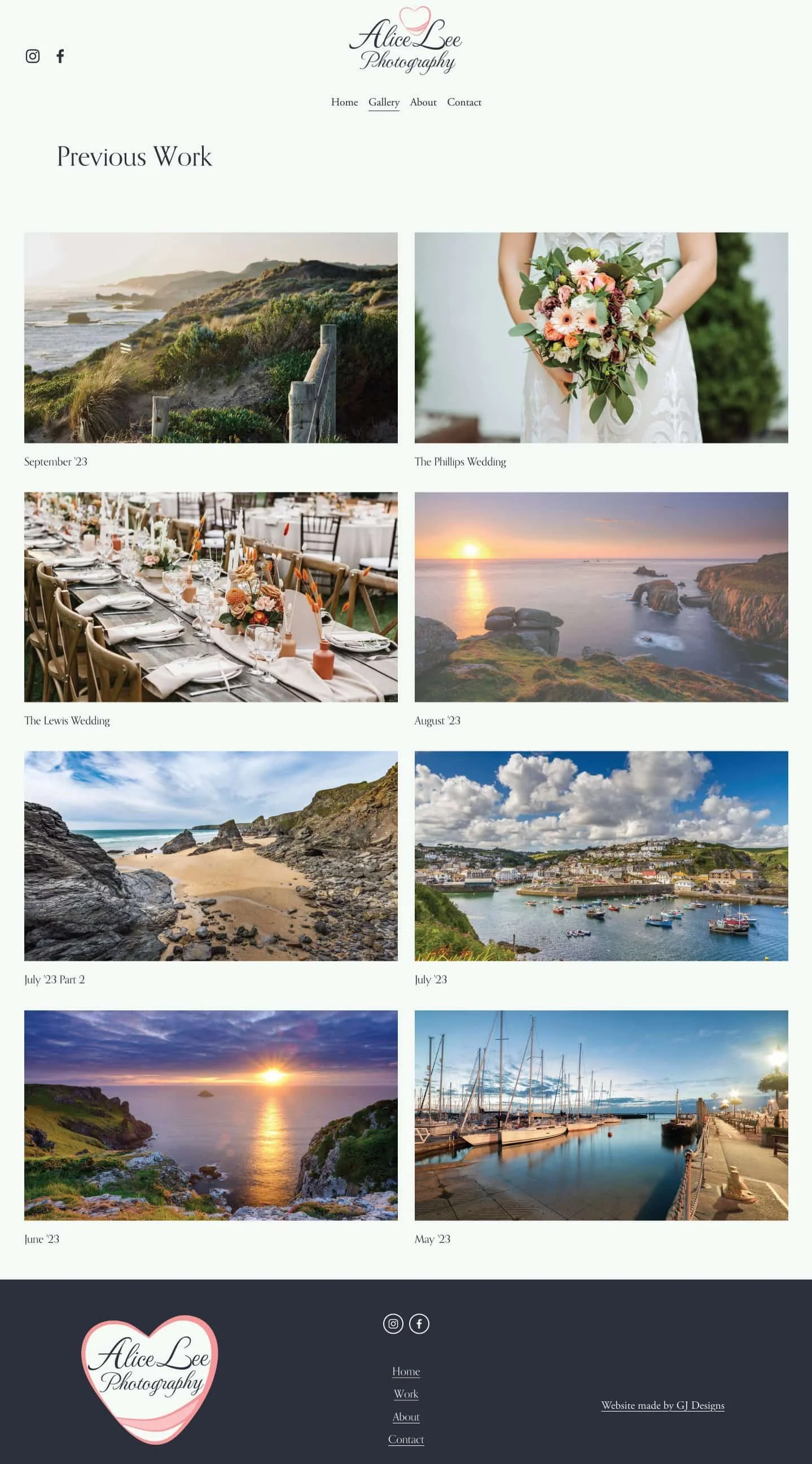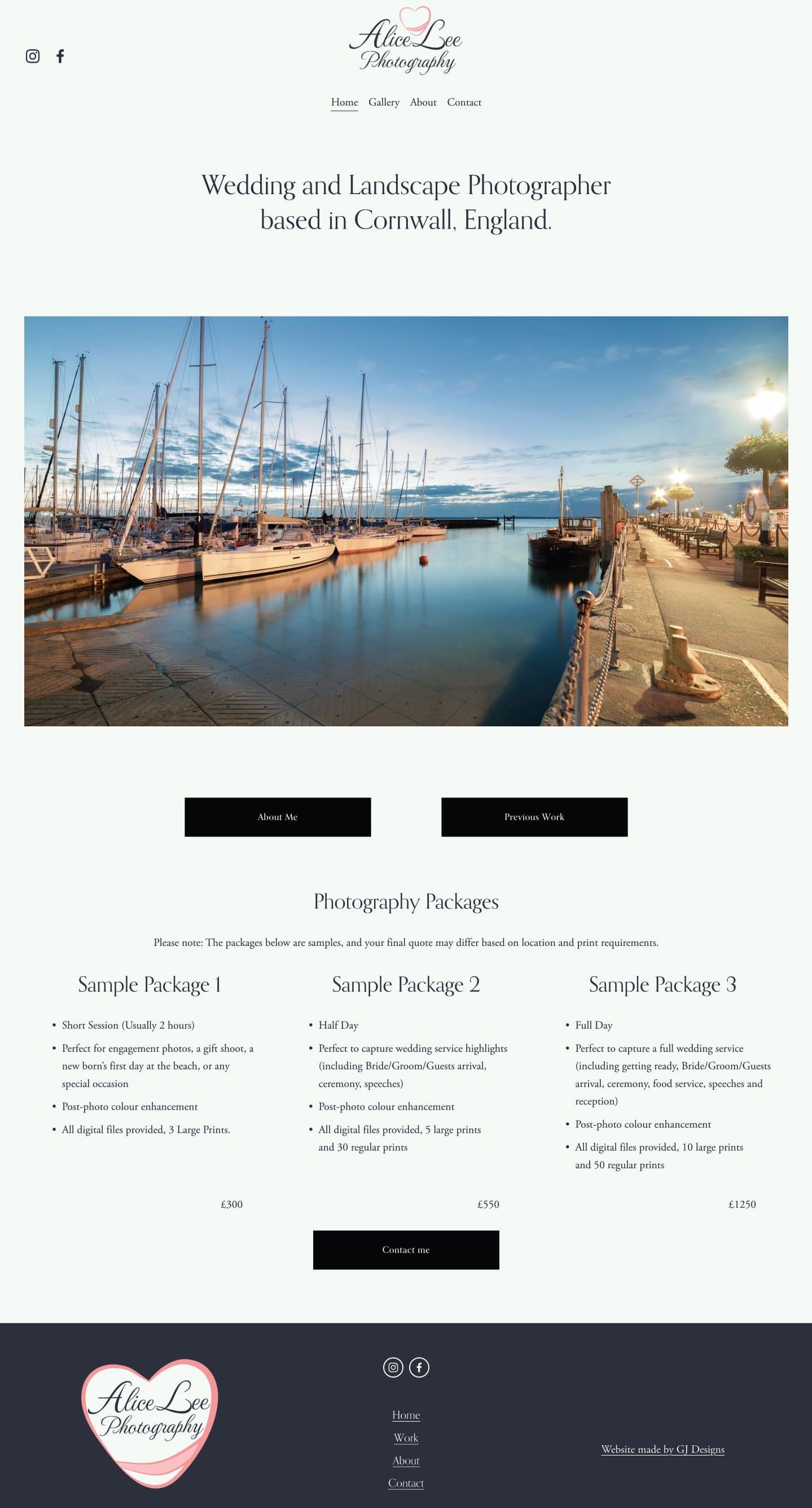 Alice Lee Photography is a beautifully designed, multi-page website created for a talented wedding and landscape photographer who wanted to showcase her work in a way that truly reflects her artistry. The goal was to provide a visually engaging and user-friendly online space where potential clients can explore a curated portfolio of photographs, learn more about the photographer’s style, and easily make contact to discuss bookings.